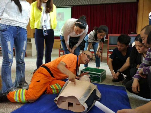 培训由宜宾卫校高级讲师、市红十字会救护培训师资吴坚主讲,同时宜宾市红十字应急救援志愿者服务队的队员们也在现场开展辅助教学。在理论学习中,学员们学习到了救护新概念、心肺复苏法、创伤救护四项基本技术(止血、包扎、固定、搬运)等知识,并进行了理论考试。