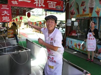一口气甩上几盘,在老板提醒后田波才休息。阳光照射下,抡开膀子甩面的他满头大汗,猛灌几口水,喘了好几口气才缓过来。听着音乐还在继续,休息的田波又在锅边给正在甩面的同事打下手、喝喝彩。