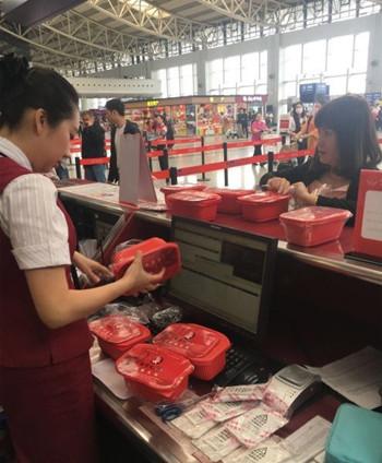 十余盒自热火锅,丢掉可惜,办理快递又来不及,旅客一时不知该怎么办。见此情况,川航值机室值班副主任曾祯对该旅客支招:自热火锅里面的发热包不能带,但是,取出发热包后方便火锅还是能携带上飞机的。最后该旅客把自热火锅盒的塑封一一撕开,取出盒子底部的发热包,一箱“安全”、美味的火锅随旅客顺利“乘机”了。
