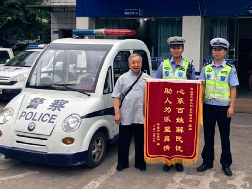 四川新闻网宜宾6月20日讯(李险峰)6月15日上午,71岁的文老将一面写有“心系百姓解民忧,助人为乐显真情”的锦旗递到宜宾县公安局交通管理大队民警手中,以感谢民警帮助自己找回丢失的手机。