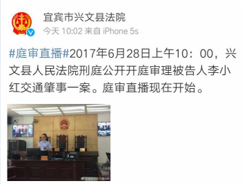 四川新闻网宜宾6月30日讯(赵一民)6月28日上午10:00,兴文县人民法院公开开庭审理被告人李小红交通肇事一案。庭审过程在中国庭审公开网和兴文法院官方微博进行了同步直播。