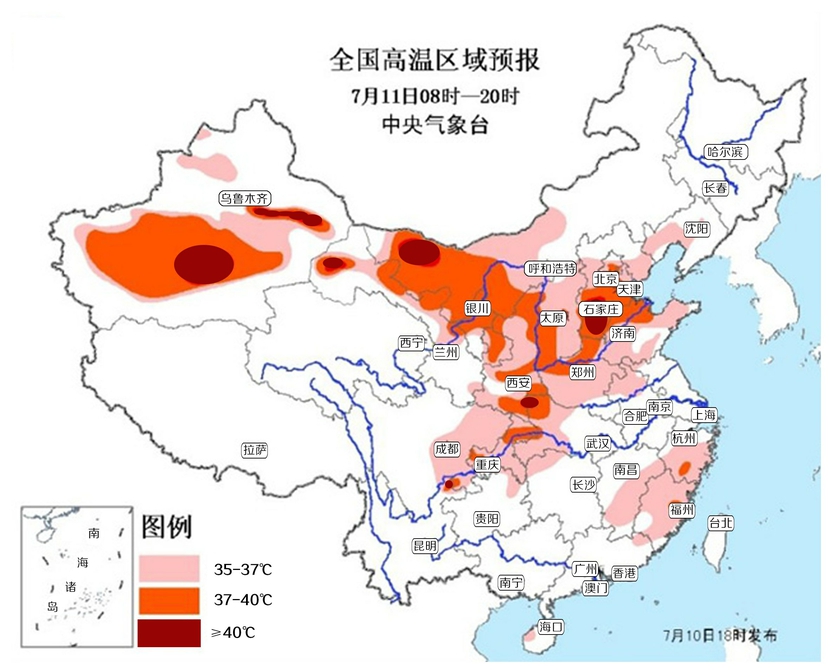 全国高温区域预报(7月11日08时—20时)中央气象台 制图/杨仕成