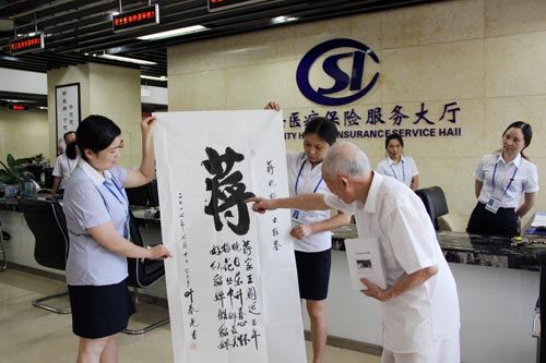 四川新闻网宜宾7月14日讯(唐仕华)7月11日上午,宜宾县政务大厅医保局窗口迎来了一位特殊的老人,老人一来到窗口前就激动的说“你们对工作太负责了,你们的服务太周到了,我太满意了。”随即,老人又从随身携带的包里取出5个文具袋,递给医保工作人员,老人家说:“这是我自己写的几篇书法作品和我的一本自编诗集,送给你们,你们务必收下,谢谢你们热情周到的服务”。
