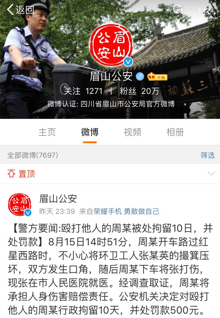 四川新闻网眉山8月16日讯(郑佳洁 记者 岳东)8月15日下午,在眉山红星路,一黑衣男子驾车不慎将环卫女工的撮箕压坏,随即双方发生口角。本是一件小事,然而黑衣男子下车后殴打环卫女工人。本网经过多方调查后,以《眉山红星路一男子殴打女环卫工人 警方已介入调查》为题进行报道后,引发社会关注。昨(15)日23时39分,眉山市公安局做出回应,其官方微博发布消息:对殴打他人男子周某行政拘留10天,并处罚款500元。