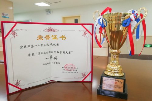 宜宾一医院参赛全国品管圈大赛捧回的荣誉证书及奖杯