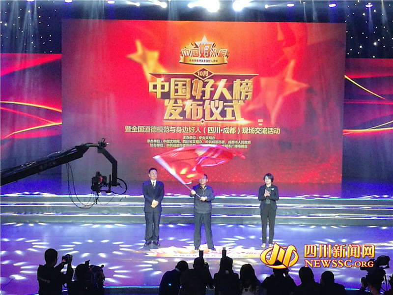 四川新闻网成都10月31日讯(记者 梁鹏 摄影报道)一个个平凡的人物,一件件感人的事迹,如粒粒金沙,聚沙成塔、聚水成涓,形成“践行核心价值观、传播道德正能量”的社会氛围。10月31日,由中央文明办主办,中国文明网、四川省文明办,中共成都市委、成都市人民政府承办,中共成都市委宣传部、成都市文明办等协办的10月“中国好人榜”发布仪式暨全国道德模范与身边好人(四川·成都)现场交流活动在成都举行。