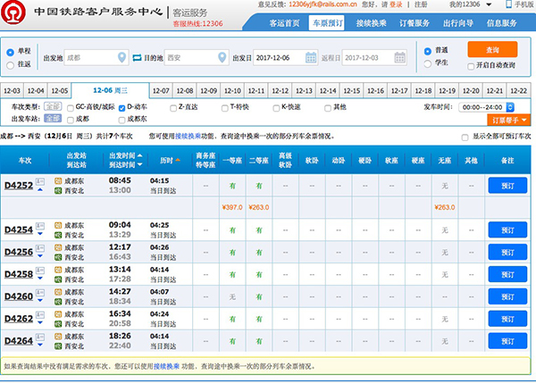 四川新闻网记者查询12306中国铁路客户服务中心官方售票网站发现,12月6日开通当天,西成高铁开行成都东至西安北动车组列车7对,分别为D4264、D426、D4260、D4258、D4256、D4254、D4252次。其中从成都出发最早班次为D4252次,8:45分开车,13:00到达西安北,历时4:15分钟,最晚班次为D4264次,历时4:14分钟,18:26发车,22:40到西安北。最快的一趟为D4260次,14:27分从成都东发车,18:34分到达西安北,全程历时4:07分钟。记者了解到,成都至西安的最短旅行时间压缩至4小时7分,年底实施新的列车运行图后,两地间最短旅行时间将压缩至3小时27分,较原来两地间最短旅行时间压缩了7小时。