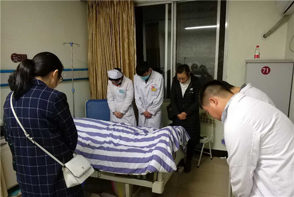 医务人员和自贡市红十字会工作人员向曾利桃的遗体鞠躬默哀致敬(自贡市红十字会供图)