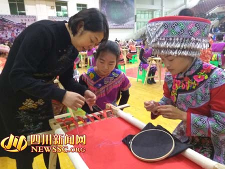 四川新闻网宜宾12月15日讯(胡先映 记者 熊强 摄影报道)12月15日,中国非物质文化遗产——苗绣“大师培训计划”启动仪式在宜宾兴文举行,150名苗家妹子现场向5位非物质文化优秀传承人拜师学艺。