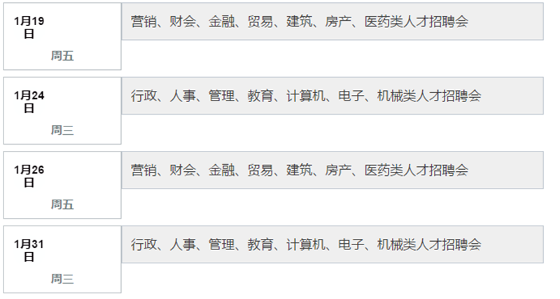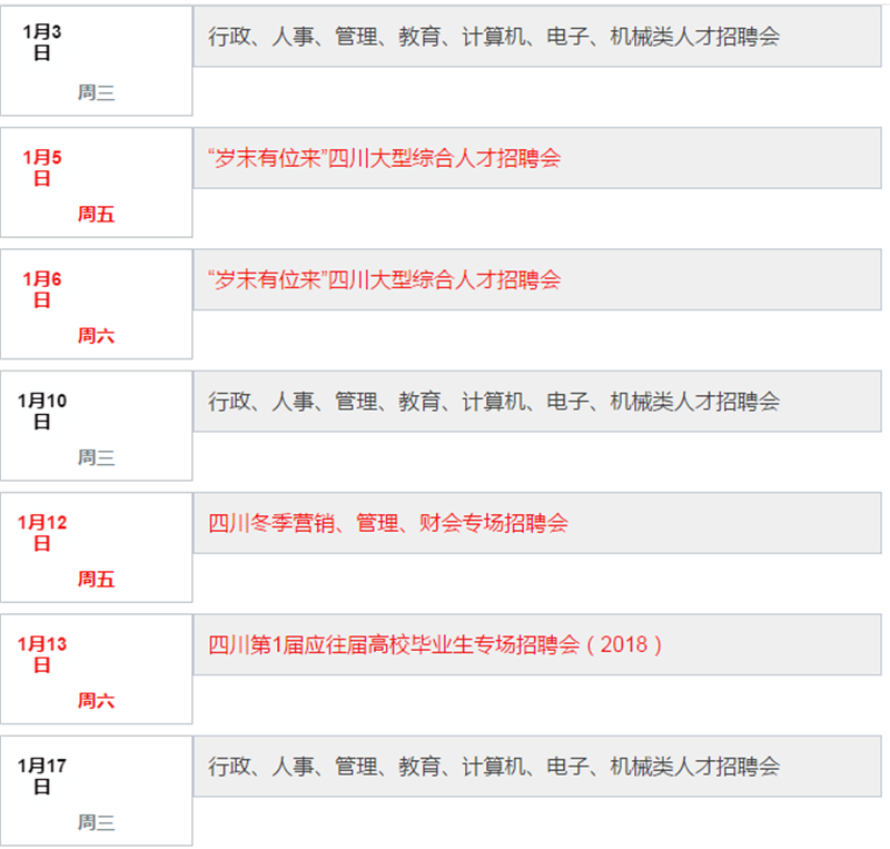 四川新闻网记者梳理发现,既有1月5日、6日的“岁末有位来”四川大型综合人才招聘会;也有1月13日的四川第一届应往届高校毕业生专场招聘会(2018);还有四川冬季营销、管理、财会专场招聘会,行政、人事、管理、教育、计算机、电子、机械类人才招聘会等多场招聘会。