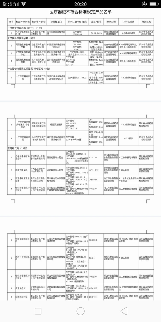 其中,1批一次性使用输液器、3批天然胶乳橡胶避孕套、3批一次性使用便携式输注泵和13批次医用电气类产品。3批次天然胶乳橡胶避孕套,有两批次在漏水试验中发现针孔,出现了漏水的情况,另一批次不合格则为未处理的避孕套。