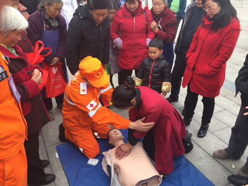 此外,市红十字会还组织开展了急救知识技能的现场讲解和示范,得到了乡亲们的集体点赞和围观学习。市红十字会应急救援队的四名老师先后为大家普及了心肺复苏、气道异物梗阻、止血包扎等技能。“当有人昏倒,首先要判断病人意识,要用双手轻拍双肩高声呼喊,如果没有反应,还要观察病人胸部起伏5-10秒,如果没有起伏,我们要在患者两乳头连线中点两手重叠,左手五指翘起,双臂深直,用上身力量用力按压30次。”