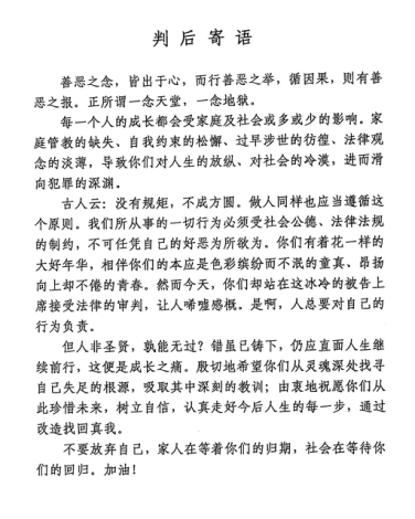 在这份寄语中,兴文法院法官以和朋友谈心的口吻对失足未成年人进行开导:一是要深刻反省自己走上犯罪道路的原因,追根溯源提高自身思想认识,明白做人应该有原则、讲规矩、守法律;二是要接受自己的审判结果,努力改正自己犯下的过错,有从头再来、洗心革面的决心和信心,不辜负家人、社会的帮助与期盼。