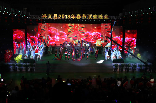 四川新闻网宜宾2月7日讯(申勇 摄影报道)2月6日晚,宜宾兴文县2018年春节联欢晚会在县体育馆热闹举行,歌舞、相声、杂技、朗诵等精彩节目纷纷上演,为全县49万各族同胞送上新春的祝福。