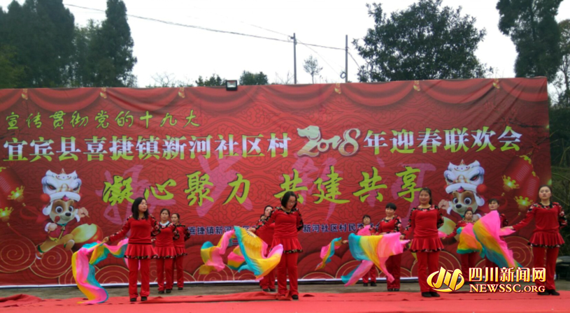 四川新闻网宜宾2月8日讯(胡先映) 2月8日,宜宾市宜宾县新河社区村处处充满了浓郁喜庆氛围,村民们自发组织编排、演绎了14个精彩的文艺节目,迎接新年。