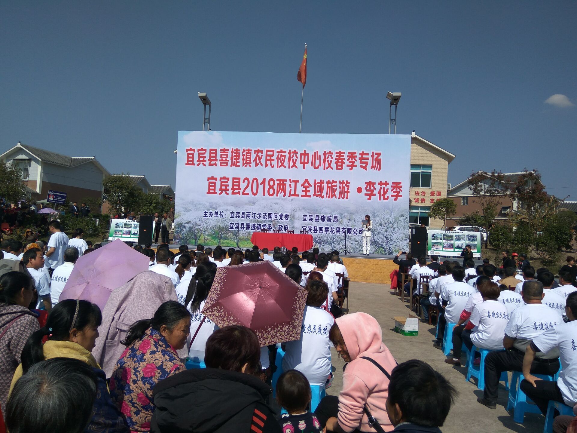 四川新闻网宜宾3月8日讯(胡先映 摄影报道)为进一步办好办实农民夜校,提升教学实效,激励全镇干部群众弘扬三先精神,践行五正要求,推动乡村振兴,助力富民强镇,3月8日下午,由宜宾县两江园区党委、县旅游局、喜捷镇党委政府举办的宜宾县喜捷镇农民夜校中心校春季专场暨2018两江全域旅游·李花季活动在喜捷镇宰龙村开幕。本次李花季活动将由3月8日持续到3月17日,活动期间,幸福公社准备了广场舞表演、千人瑜伽 、家庭帐篷春游 、公益彩跑等一系列好玩的活动。