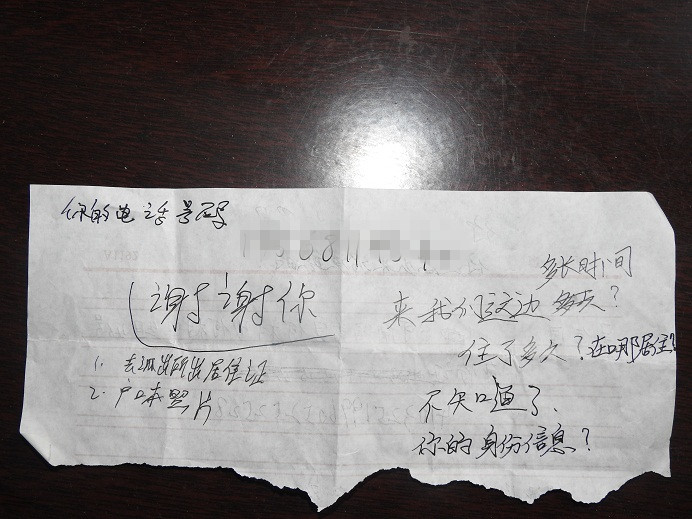3月8日下午15时许,泥溪镇派出所户籍民警在办理业务中发现正在排队的群众中有一名20岁左右的女士神情焦虑,轮到自己办理业务时躲躲闪闪,不敢上前说出需要办理的事项。民警见状便主动询问,但该女士闭口不语,似乎听不清民警的问话,焦急中向民警出示了一张字条。民警接过字条后发现在字条的左下角写着“去派出所出居住证、户口本照片”。民警意识到该女士很可能是聋哑人士,她的目的是到派出所办理居住登记以便异地补办居民身份证。由于该女子无法正常表达自己的意愿,民警在“实有人口”登记中遇到了难题。反复揣摩着该女子出示的字条,民警判断女子可能有识字能力,便尝试着在字条上写出询问身份信息的问题,该女子看到民警提出的问题后神色渐渐缓和下来,提笔在字条上慢慢写出自己的名字、家庭住址和身份证号码。民警继续提问该女子在泥溪镇的具体住址和居住缘由时,该女子陷入了沉思并写下“不知道了”。眼看该女子无法回答提问,民警通过村组干部警务工作QQ群发布该女子的基本信息,请村组干部们协助核实该女子的居住状况。