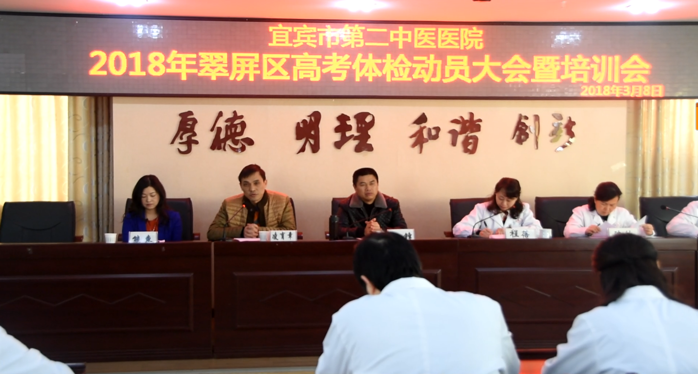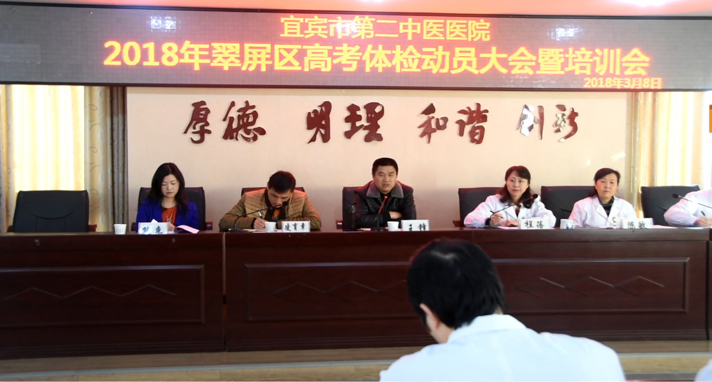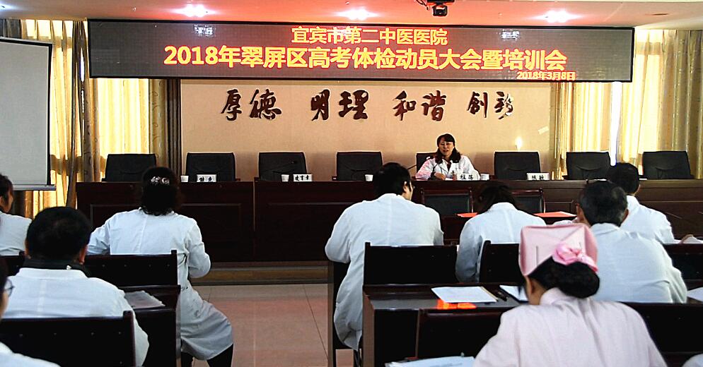 四川新闻网宜宾3月9日讯(付新淇 唐何娟 ) 2018年3月8日上午9点,宜宾市中医医院在三楼会议室组织召开了2018年普通高等学校招生体检工作动员暨培训大会。区卫计局党委委员、副局长、区高考体检领导小组副组长王锋、区招办分管高考体检工作副主任凌育章等领导,医院院班子全体成员、高考体检领导小组成员,以及此次高考体检全体参检医务人员参加了此次动员暨培训大会。会议由医院副院长、高考体检工作领导小组副组长龙海兵同志主持。