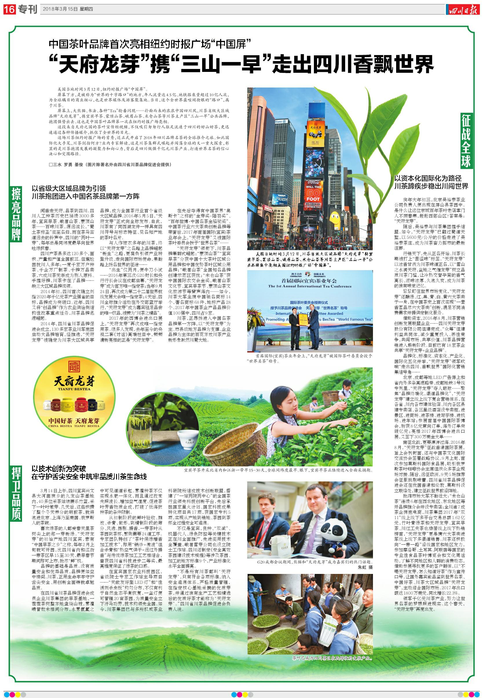 2014年,四川省川茶品牌促进会成立,130多家茶业川军抱团启动大品牌培育,经推选,“天府龙芽”被确定为川茶大区域共享品牌,成为全国茶行业首个省级大区域品牌。2016年5月5日,“天府龙芽”正式向全球发布。自此,川茶有了同西湖龙井一样具有四川符号与标志特征、见名知产地的茶叶名片。