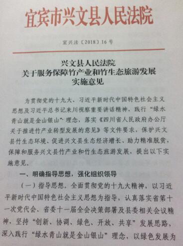 四川新闻网宜宾3月20日讯(陈诺) 为深入贯彻落实党的十九大精神,落实《四川省人民政府办公厅关于推进竹产业转型发展的意见》等文件要求,兴文法院出台《关于服务保障竹产业和竹生态旅游发展实施意见》,以保障和服务兴文县竹产业和竹生态旅游发展,促进兴文县生态经济增长,助力精准脱贫。