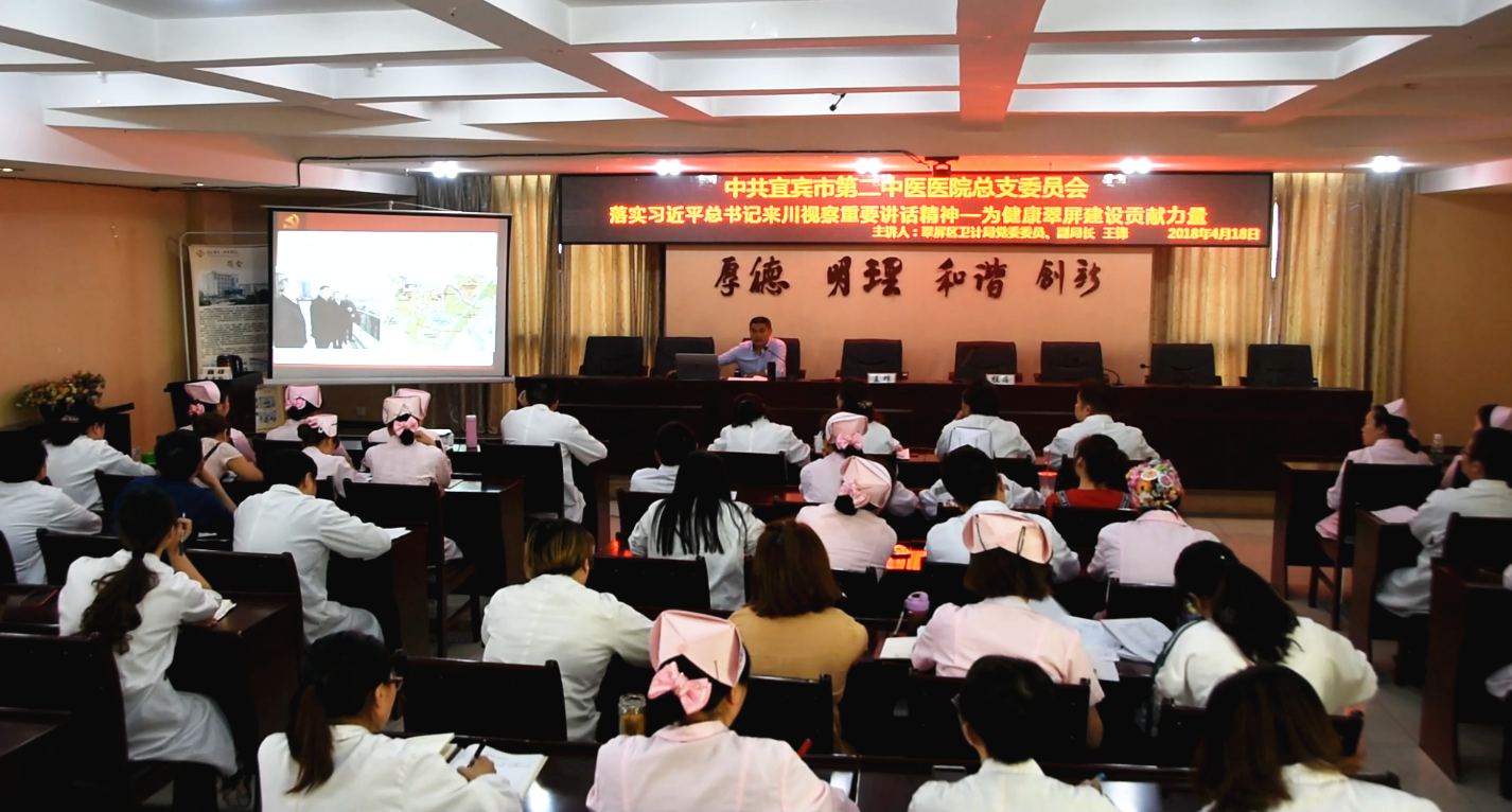 四川新闻网宜宾4月19日讯(陈怡)2018年4月18日下午,宜宾市第二中医医院党总支邀请宜宾市翠屏区卫计局党委委员、副局长王锋为全院职工作习近平总书记来川视察重要讲话精神宣讲——《落实习近平总书记来川视察重要讲话精神—为健康翠屏建设贡献力量》。医院党总支书记、院长程蓓主持会议。