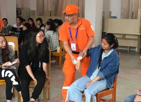 培训由宜宾卫校高级讲师、市红十字会救护培训师资吴坚主讲,同时宜宾市红十字应急救援志愿者服务队的队员们也在现场开展辅助教学。在理论学习中,学员们学习到了救护新概念、心肺复苏法、创伤救护四项基本技术(止血、包扎、固定、搬运)等知识,同时发放了红十字运动起源、红十字标志的使用、预防艾滋病、造血干细胞和器官遗体捐献等宣传资料。