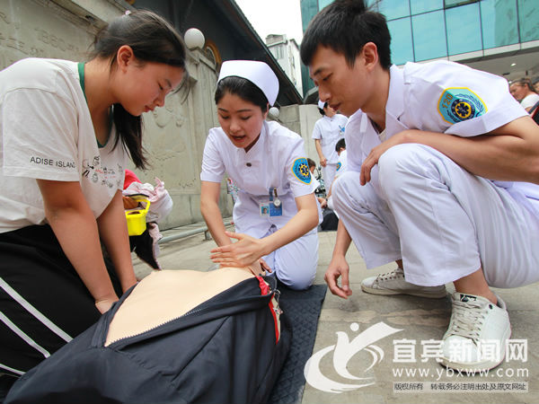 四川新闻网宜宾5月14日讯(宜宾市第一人民医院供)“喂,你怎么了?”“1001、1002、1003、1004、1005”……5月12日,宜宾市第一人民医院A区停车场上,几名护理人员正在为多个“病人”进行双人心肺复苏,引起了路人、病员和家属的围观。