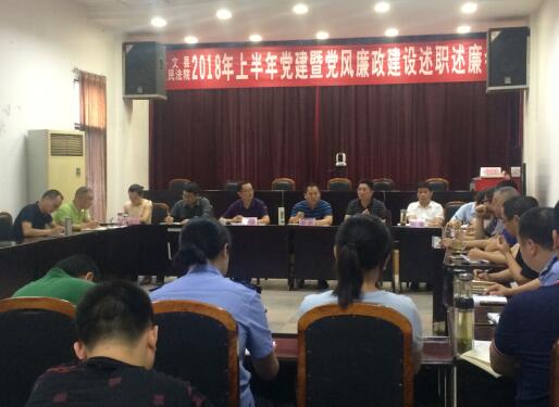 会上,彭家昌书记作了上半年党建工作总结,汇报了兴文法院上半年党风廉政建设和反腐败工作中的思想建设、组织建设、队伍建设、作风改进情况,提出下半年兴文法院要继续认真学习贯彻习近平新时代中国特色社会主义思想和十九大精神、压实党建主体责任、全面提升党员能力素质。