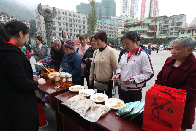 现场还设置了农特产品展示暨“以购代捐”活动,今年拟退出的各贫困村展示展销本村的应季农特产品,向前来参观选购的市民介绍本村产业发展情况。现场吸引过往市民选购产品,用实际行动助力脱贫攻坚。