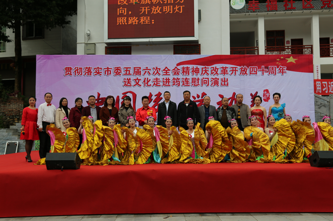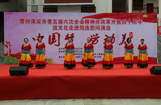 为认真学习贯彻党的十九大精神,颂扬祖国改革开放四十年取得的伟大成就,打造健康文明、昂扬向上的职工文化,把职工凝聚到筠连县的各项建设工作中来,10月19日,宜宾市总工会在塘坝乡幸福社区主办“贯彻落实市委五届六次全会精神,庆祝改革开放四十周年”送文化到基层活动。“文化下基层活动的隆重举办, 给筠连人民送来优质的精神食粮,带来艺术的享受,十分感谢宜宾市总工会的关心和演员们的付出。”筠连县相关负责人说。