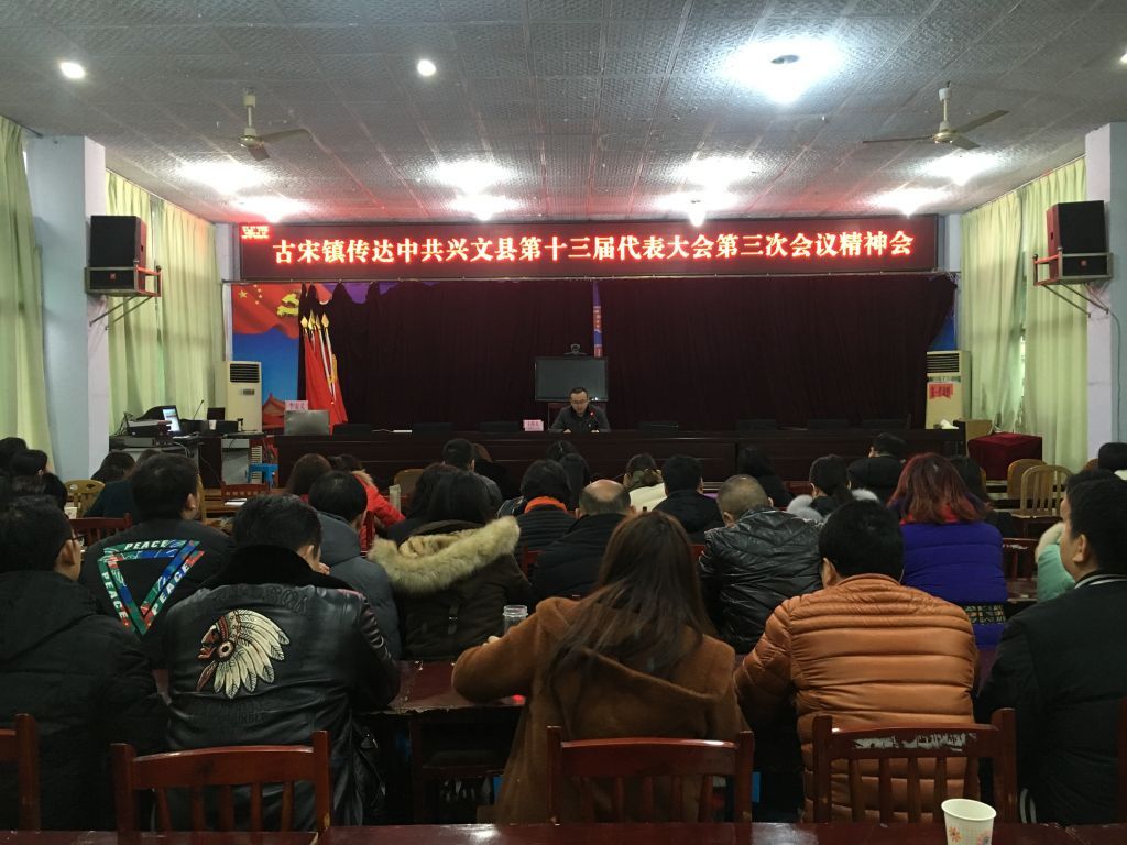 2018年12月11日,古宋镇魏黔书记向全镇机关职工、社区干部传达中共兴文县第十三届代表大会第三次会议精神:一是通报大会主题。二是回顾兴文县2018年在项目建设、产业质效、民生福祉、生态建设、精神文明、民主法治、党的建设等方面取得的成绩。三是通报2019年兴文县地区生产总值增长10%左右,固定资产投资增长11%左右,一般公共预算收入增长11%左右的工作目标。四是通报2019年兴文县工作安排。