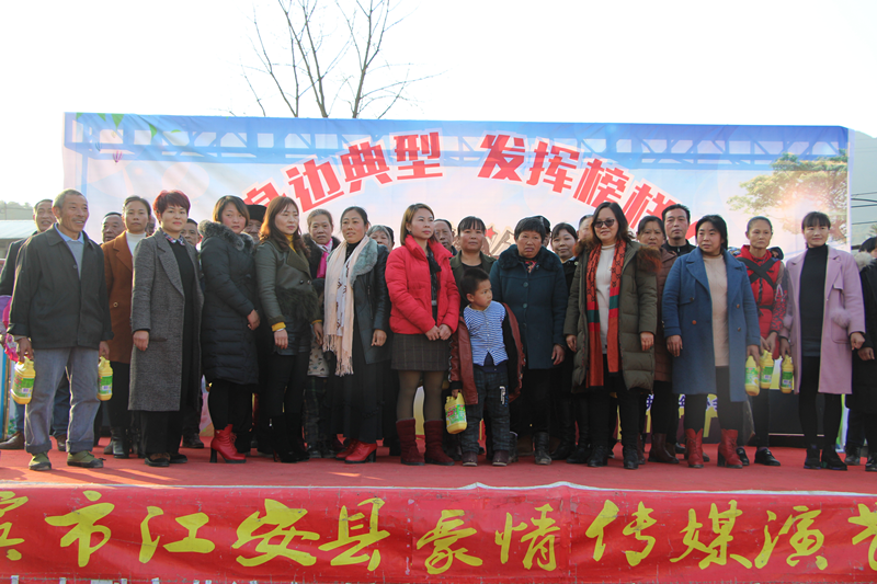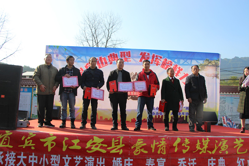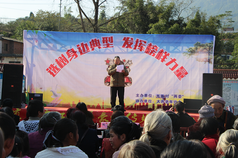 四川新闻网宜宾12月18日讯 (邹锦容宋秋桦、裴登其)12月16日,九角村聚居点艳阳高照、喜气洋洋、热闹非凡,载歌载舞表彰了53名“身边的榜样”。大井镇组织委员邹锦容、大井镇老年协会支部书记裴登其、江安橙乡网杨汉启和部分村妇联主席出席了颁奖典礼。
