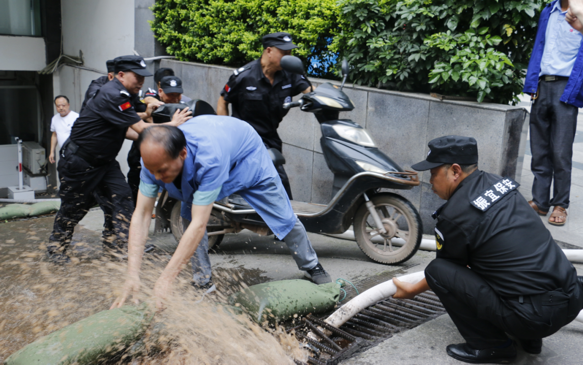 此次演练是模拟受强降雨导致三医院院坝通往地下停车场、青年街后门通往院坝西药房等地势低洼处大量雨水倒灌危及地下停车场车辆、住院部大厅医疗仪器等财产安全的情形。