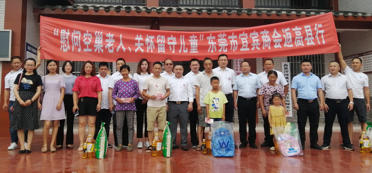东莞宜宾商会会长杜远春、执行会长陈林等14名会员企业家代表先后到高县沙河镇、罗场镇、落润镇、嘉乐镇看望空巢老人和留守儿童,并送去慰问金、米、食用油、书包,价值2.4万余元。