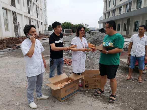 宜宾市第二中医医院领导将慰问品分发到各个工人手中,连连道着“大家辛苦了!天气炎热,注意防暑。”随后,程院长向施工方负责人嘱咐:“一定要调整好施工时间,避开高温施工,确保工人安全。要把安全问题放在首位,把防暑降温工作和安全工作相结合,保障工程施工工作平稳有序地开展。”
