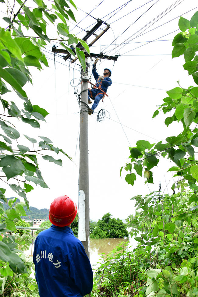 8月18日上午,四川宜宾翠屏供电公司菜坝供电所员工侯卫东、刘汉军在菜坝村2涉社台区201号杆拆除下划线,实施停电作业。菜坝村受灾严重,洪水距离防洪堤坝低处护栏仅40厘米,水位仍在上涨,当日还将有洪峰过境,为保障居民生产生活、人生安全,目前该村一大部分已经实施停电,供电所安排值班人员24小时待命,做好巡视,监测以及后期的供电恢复工作。