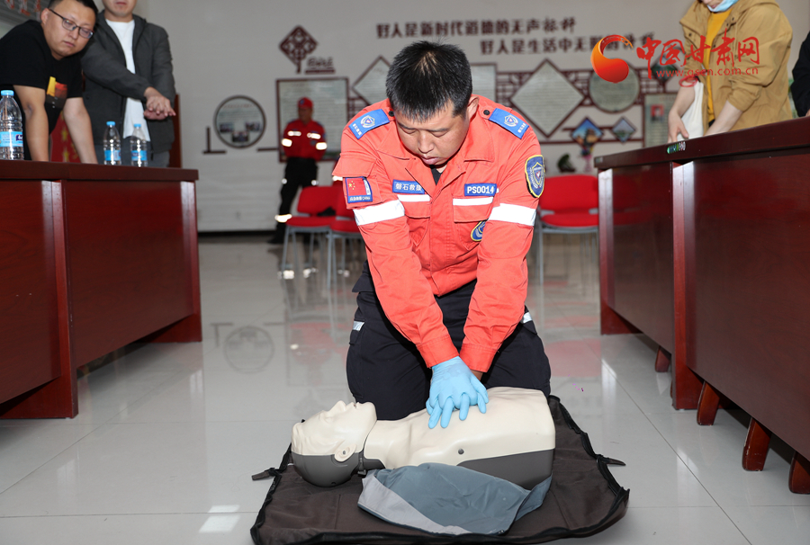 李建新就是持有红十字救护员证的专业救护队员,9月23日,他给全国网络媒体记者演示了心肺复苏规范操作,每个步骤都有条不紊并且时刻保障救援时的自身安全。