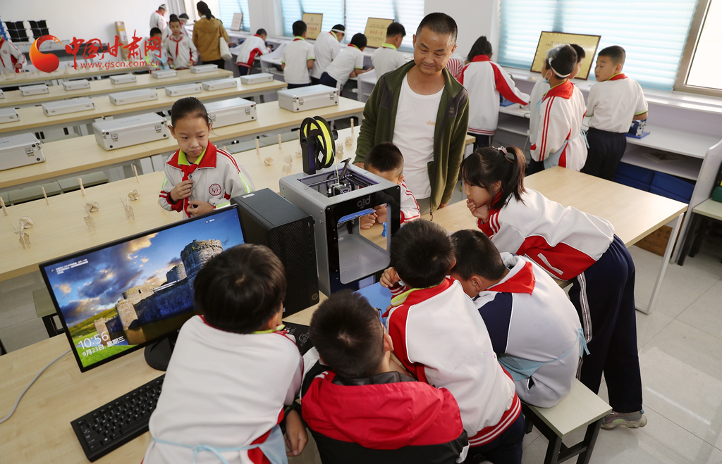 在创客教室,教师杨立荣正带领学生制作模型,通过对模板的切割拼接,一个个平面的木板组合成了立体的动物、建筑,让学生在实践的过程中,创新思维、科学素养得到提升。