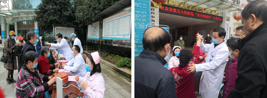 义诊活动中,慕名而来的患者在义诊台前有序排好队,医护人员通过免挂号诊查、免费测血压、免费健康咨询等形式开展义诊服务,耐心细致地为前来咨询看病的群众提供各类慢性疼痛的咨询、筛查、诊断并进行健康宣教,提出合理化的方案和建议,让群众正确认识疼痛、重视疼痛、管理疼痛。
