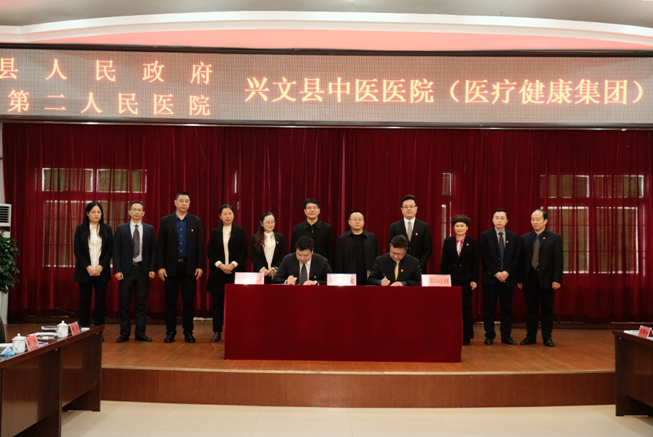 兴文县政府石进县长与市第二人民医院姜雄院长签订了《宜宾市第二人民医院托管兴文县中医医院和兴文县中医医院医疗健康集团协议书》。