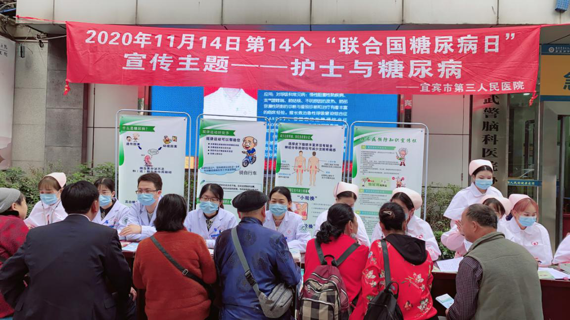 四川新闻网消息(吴丽娟 秦有容)2020年11月14日是第14个联合国糖尿病日,今年的宣传主题是“护士与糖尿病”,旨在强化护理工作者在糖尿病健康管理中的重要作用。为了向广大群众普及糖尿病的防治知识,提高糖尿病患者的自我管理能力,切实降低糖尿病的危害,11月14日,宜宾市第三人民医院内分泌科医务人员和南丁格尔护理分队志愿者在市区将军街开展糖尿病义诊活动。