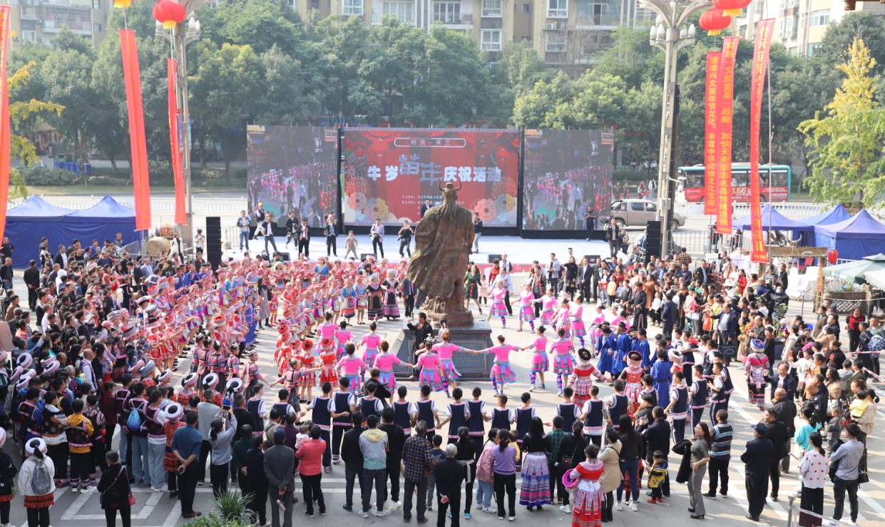 11月15日,四川•兴文牛岁苗年庆祝活动在光明新城苗城印象战神广场举行,苗族同胞载歌载舞欢庆牛岁苗年。