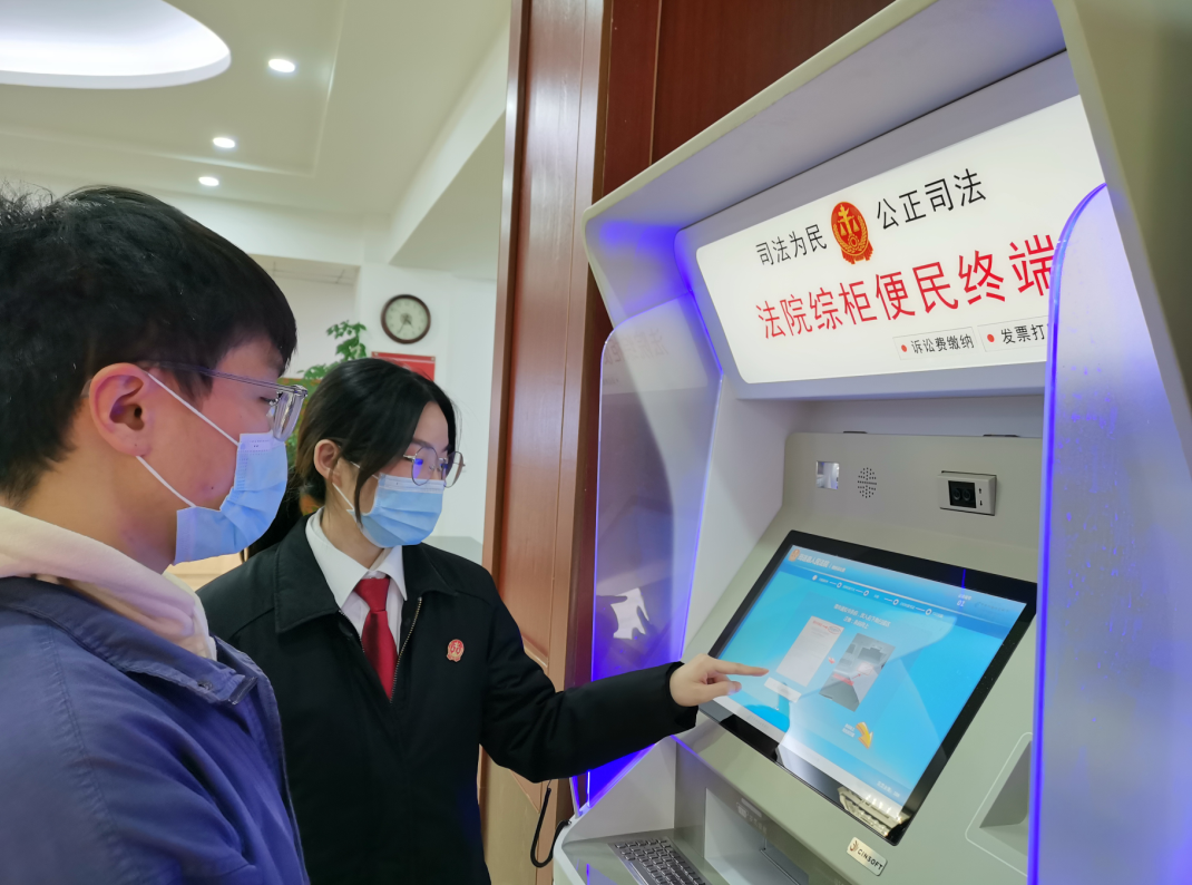 法院综柜便民终端集诉讼费交纳与诉讼服务于一体,当事人可运用微信、支付宝、银行卡等多种交费方式,直接通过该终端自主交纳诉讼费,并打印交费凭证及发票,也可以通过该终端查询各类案件办理流程指南、辖区内各法庭联系方式、法律法规等各项诉讼服务信息。