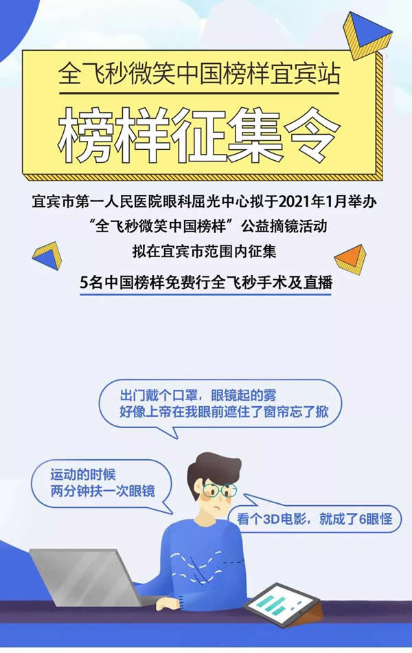 宜宾市第一人民医院眼科屈光中心拟于2021年1月举办“全飞秒微笑中国榜样”公益摘镜活动。在宜宾市范围内征集5名中国榜样免费行全飞秒手术及直播。