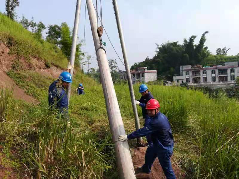 在生产施工任务较为繁重的情况下,江安供电公司专程调整计划工期,从几十里外调运电杆到岩口组。由于山路崎岖,坡滑崖陡,只得人工将千多公斤的电杆一根根抬运到确定的杆位。