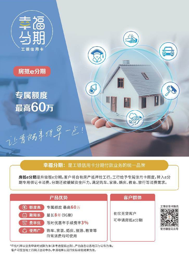 工行e分期可以将个人房产抵押专属额度100%分期到专用借记卡,分期额度比例远远大于市场上各类账单分期,最高专属额度60万。