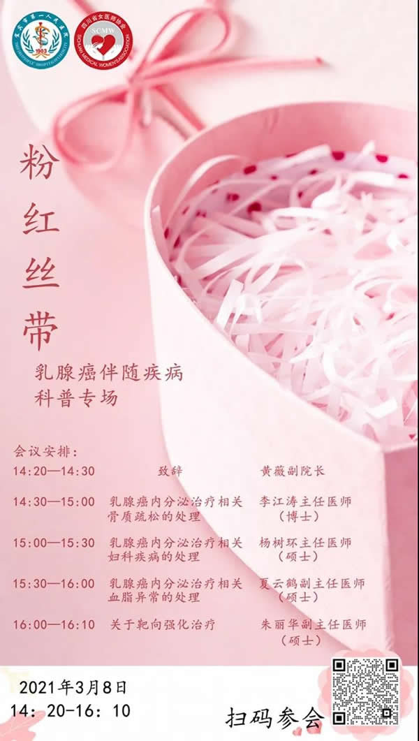 四川新闻网消息 乳腺癌发病率逐年升高,在女性恶性肿瘤中排名第一位。但是,由于有效的治疗手段的不断更新,早期乳腺癌已经是可治愈的慢性疾病。慢性疾病就像高血压,糖尿病一样,需要我们全程的管理:规律的服药,规范的处理相关的并发症。特别是长期的内分泌治疗容易出现伴随的妇科疾病,骨质相关疾病,心脑血管的并发症。 3月8日下午14:20~16:10宜宾市第一人民医院为大家特意准备一场关于乳腺癌伴随疾病的网上直播课。欢迎大家扫码观看。 直播安排 《致辞》 3月8日 14:20-14:30 副院长 黄薇 《乳腺癌内分泌治疗相关骨质疏松的处理》 3月8日 14:30-15:00 风湿免疫科主任医师 李江涛博士 擅长:系统性红斑狼疮、类风湿关节炎、多肌炎、皮肌炎、风湿性多肌痛、痛风、骨关节炎、骨质疏松症、强直性脊柱炎、纤维肌痛综合征、白塞病、银屑病、干燥综合征、风湿热、成人Still病等疾病的诊治。 《乳腺癌内分泌治疗相关妇科疾病的处理》 3月8日 15:00-15:30 妇科主任医师 杨树环 擅长:子宫肌瘤、卵巢肿瘤、子宫内膜异位症、盆底功能障碍、妇科泌尿、异常子宫出血诊治;对妇科恶性肿瘤(宫颈癌、卵巢癌、子宫内膜癌)规范治疗有较深的认识,对妇科良恶性疾病的宫腔镜及腹腔镜手术操作熟练,率先在宜宾市开展单孔腹腔镜技术。 《乳腺癌内分泌治疗相关血脂异常的处理》 3月8日 15:30-16:00 心血管内科副主任医师 夏云鹤 擅长:高血压病、冠心病、晕厥、心力衰竭、心律失常等各种心血管疾病的诊治。 《关于靶向强化治疗》 3月8日 16:00-16:10 乳腺外科副主任医师 朱丽华 擅长:乳腺癌改良根治术,保乳根治术,乳癌术后规范化全身治疗,对非哺乳期乳腺炎(浆细胞性乳腺炎,肉芽肿性乳腺炎)的保守治疗,乳腺微创旋切手术,乳头溢液乳管内窥镜检查及各种各种良性乳腺疾病的手术治疗有丰富临床经验。
