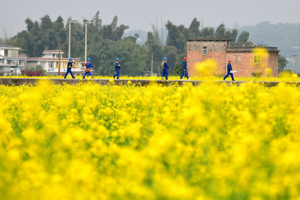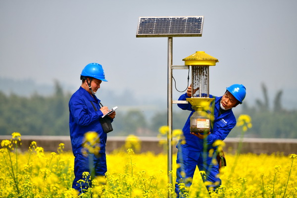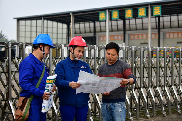 3月11日,四川宜宾供电公司怡乐供电所员工在怡乐镇丰产村为村民检修用电设备,走进港峰蔬菜基地向菜农介绍安全用电常识。(国网四川宜宾供电公司供图)