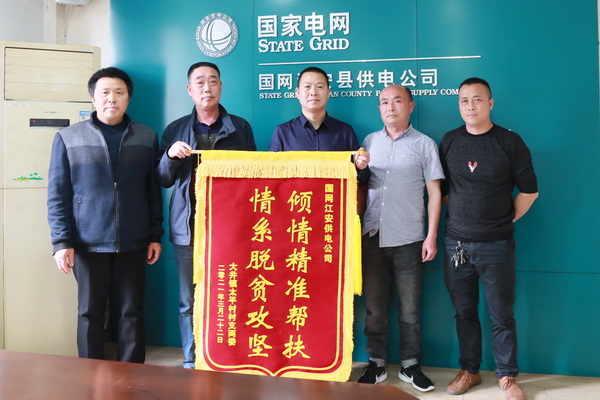 四川新闻网消息(杨义伟 陈祖容)3月26日,江安县大井镇太平村支部书记余科理、驻村第一书记刘杰将一面写着“倾情精准帮扶 情系脱贫攻坚”的锦旗送到了国网宜宾市江安县供电公司党委书记田均友的手中,衷心感谢该公司自2015年以来对他们的支持和帮助,让他们有信心和勇气战胜贫困,致富奔小康。