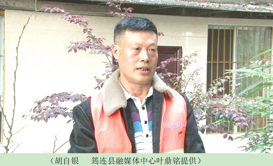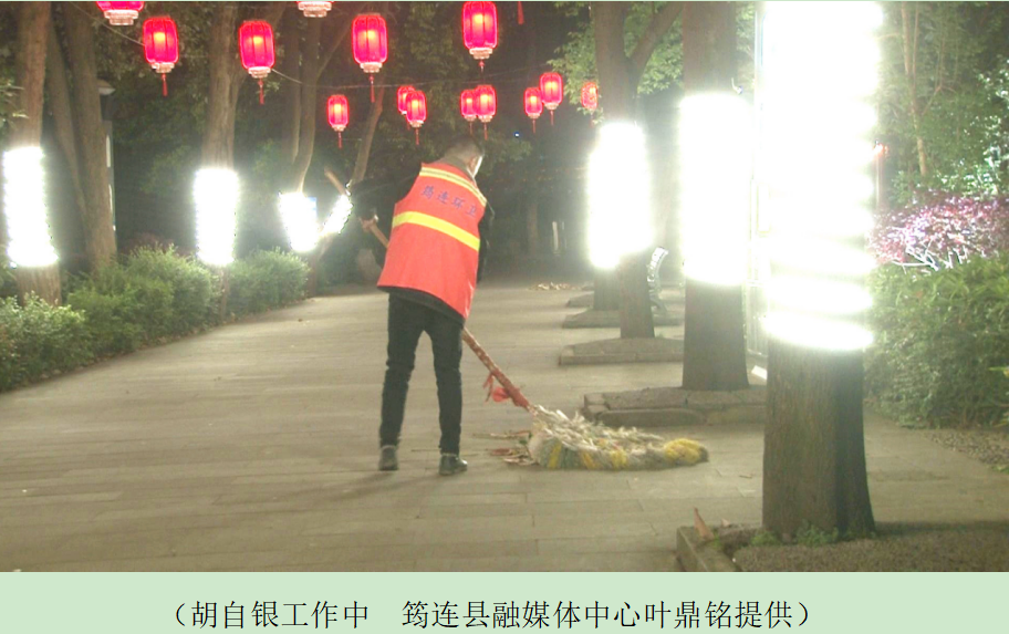 胡自银时时刻刻牢记自己的党员身份,他说:我是一名党员,我们党的宗旨就是为人民服务,我要做一颗螺丝钉,在环卫工人的岗位上,为筠连的老百姓服务。